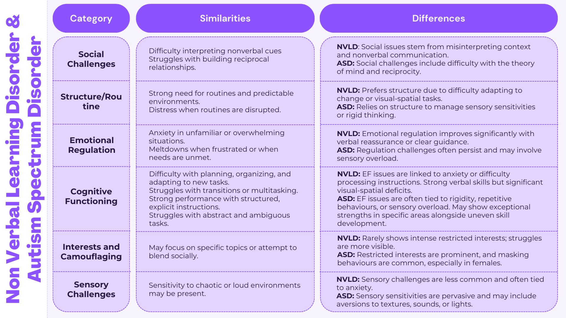 Both individuals with NVLD and ASD may struggle with self-regulation, but for different reasons. Children with NVLD may have meltdowns when they are late for school due to heightened anxiety and difficulty adapting to change. They may rely heavily on verbal reasoning to manage their emotions and need clear, structured guidance. In contrast, those with ASD might experience distress from disrupted routines due to an innate need for sameness and predictability.